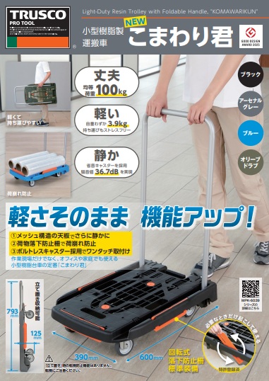 軽くて、静かで、丈夫な小型樹脂台車“こまわり君”のリニューアルモデルです。